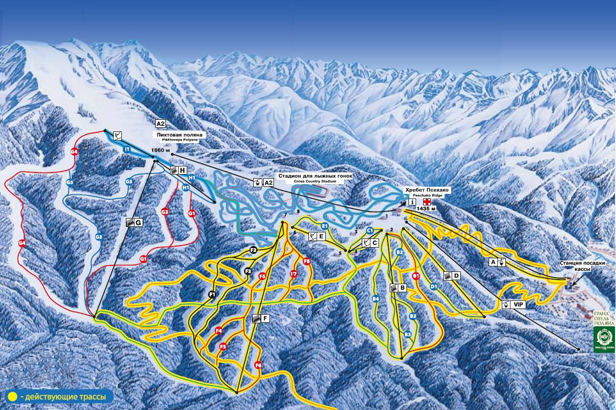 Горнолыжный комплекс находится на отрогах хребта Псехако. Пологий рельеф хребта это то, что существенно отличает курорт от других горнолыжных центров Красной поляны, и единственное место, где можно легко пробежать пару километров на беговых лыжах или покататься на собачьих упряжках. Горнолыжные трассы проложены на высотах от 890 до 1435 метров над уровнем моря. Сегодня горнолыжные трассы обслуживают 14 канатных дорог трёх видов: закрытого гондольного типа, открытые кресельные дороги и канатные дороги бугельного типа. Их общая протяжённость составит около 20 км. Для катания доступны 23 трассы (15 трасс на плато «Псехако» и 8 трасс на Пихтовой поляне).