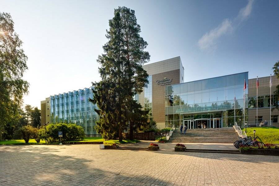 Курортное учреждение можно найти по направлению Приморского шоссе, в поселке Репино. Здесь предлагается пройти курс процедур в водолечебнице с ароматерапевтическими ваннами (читайте нашу специальную статью про полезные лечебные свойства ароматерапии). К услугам всех отдыхающих, как детей, так и их родителей, на территории пансионата имеется гидромассаж, спелеокамера, сауна и баня хамам.