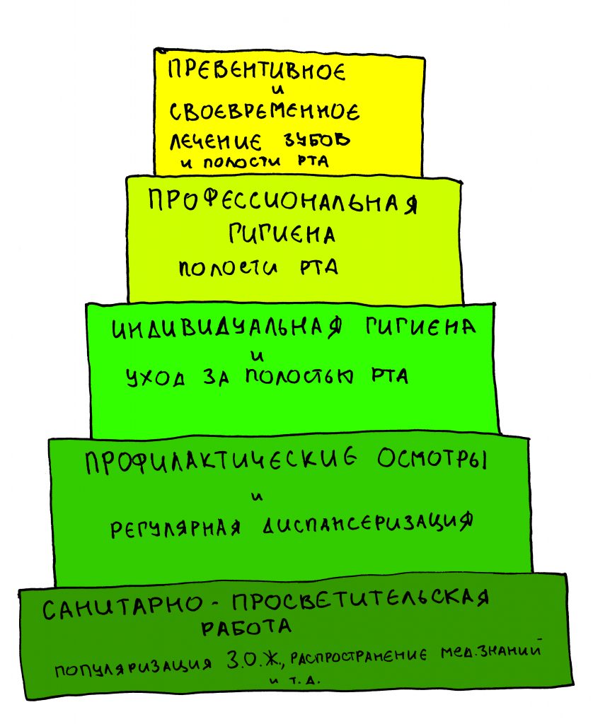 Профилактика стоматологических заболеваний – это комплекс мер, где тоже можно расставить приоритеты. И, согласно приоритетам, из этих мер тоже можно построить пирамиду. Пусть это будет пирамида Профилактоу: