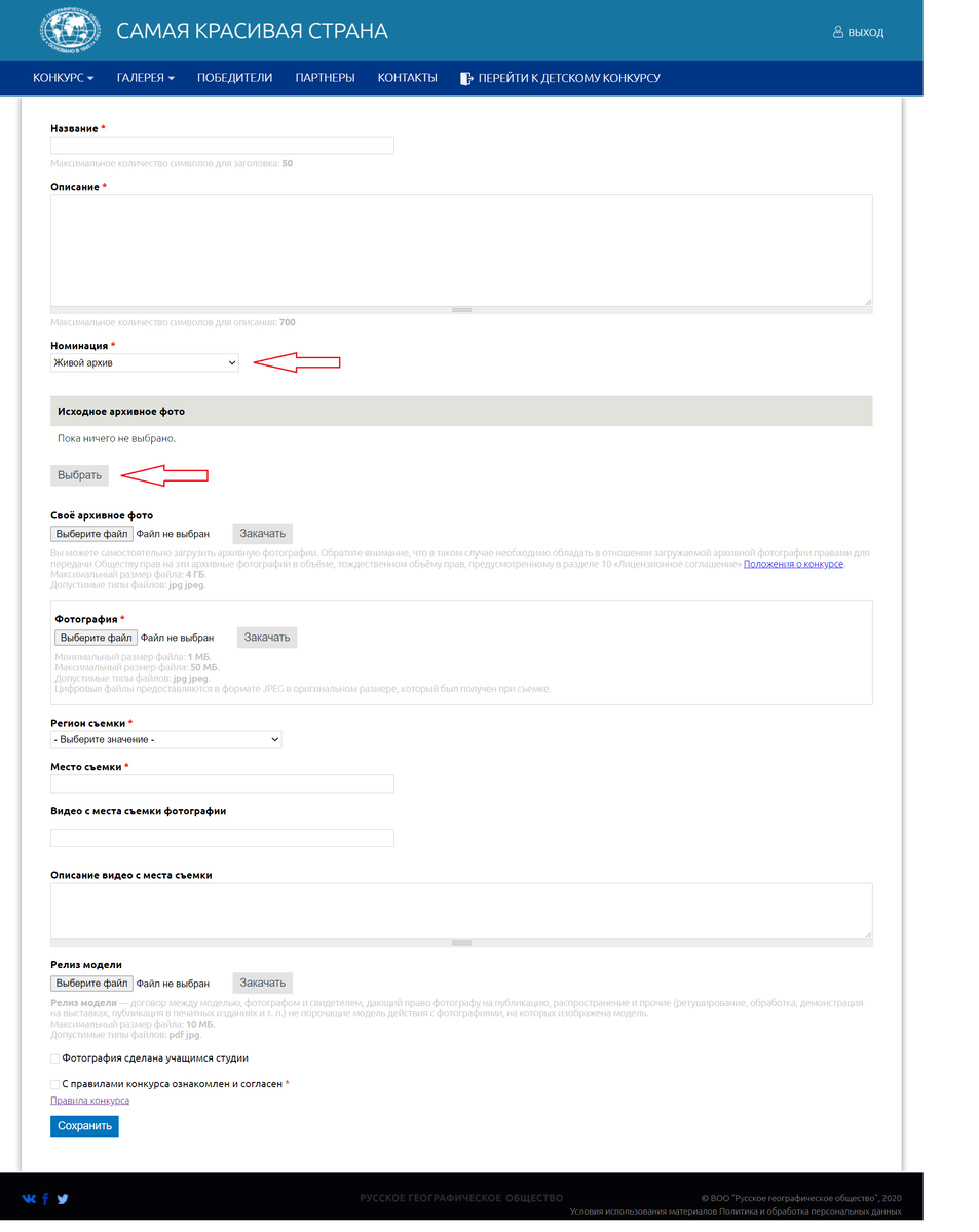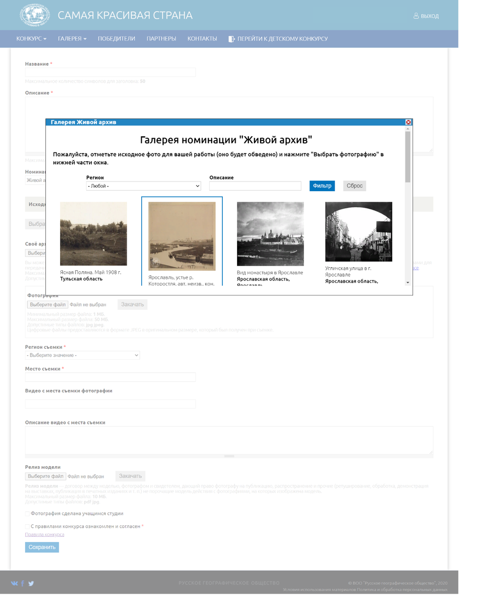 Вы можете воспользоваться фотоархивом РГО или фотографиями наших партнёров для этого выбрать номинацию «Живой Архив» выбрать интересующий кадр и добавить его и сохранить. Затем следует закачать современный вариант этой фотографии в поле “Фотография”.
