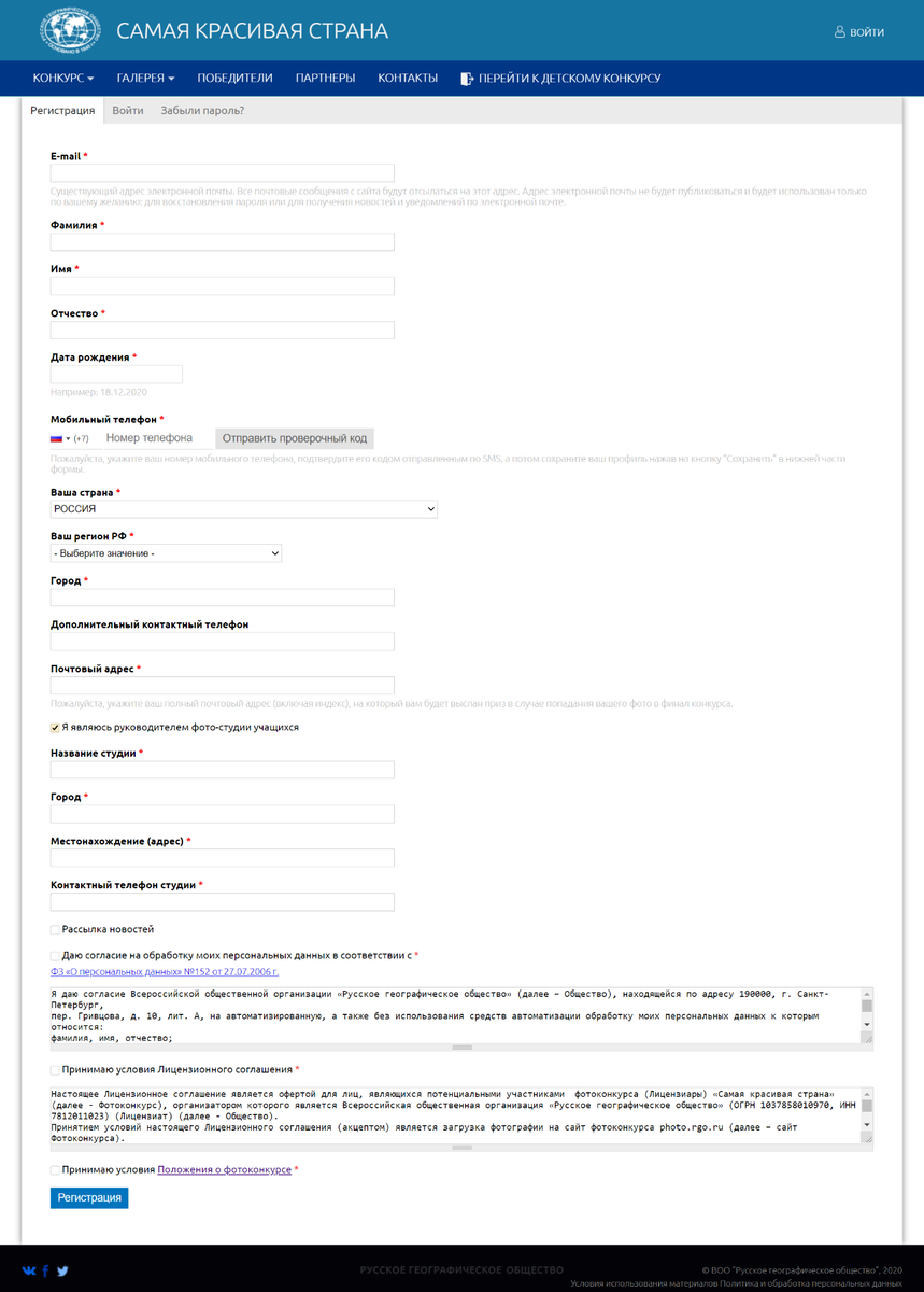 3. Если вы являетесь руководителем фотостудии и хотите зарегистрировать учащихся для участия в конкурсе, вам необходимо заполнить дополнительные поля о студии (название, адрес, телефон).