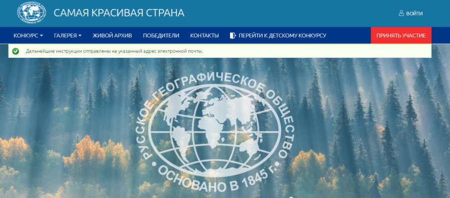 5. После успешного заполнения всех полей и нажатия кнопки “Регистрация” на сайте появится сообщение “Дальнейшие инструкции отправлены на указанный адрес электронной почты”.