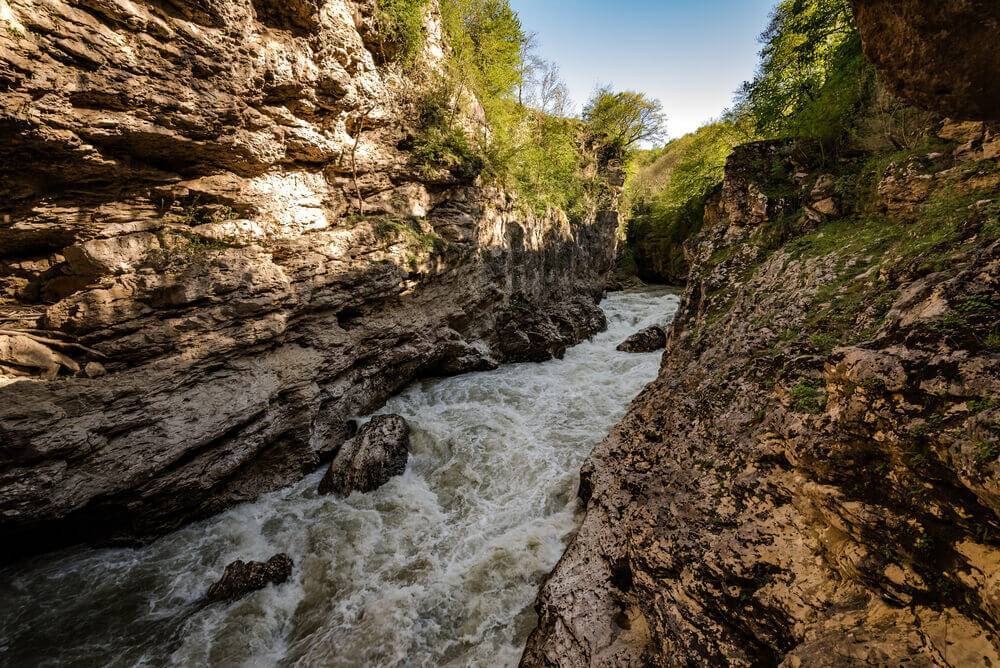 Оно стартует в пос. Каменномостский и заслуженно считается красивейшим во всей Адыгее. Речушка Мешоко много веков размывала породы горного хребта Уна-Коз. Вас ждут величественные отвесные стены высотой до 70 м. Во время экскурсии встречаются таинственные пещеры, скромные гроты и живописные водопады.