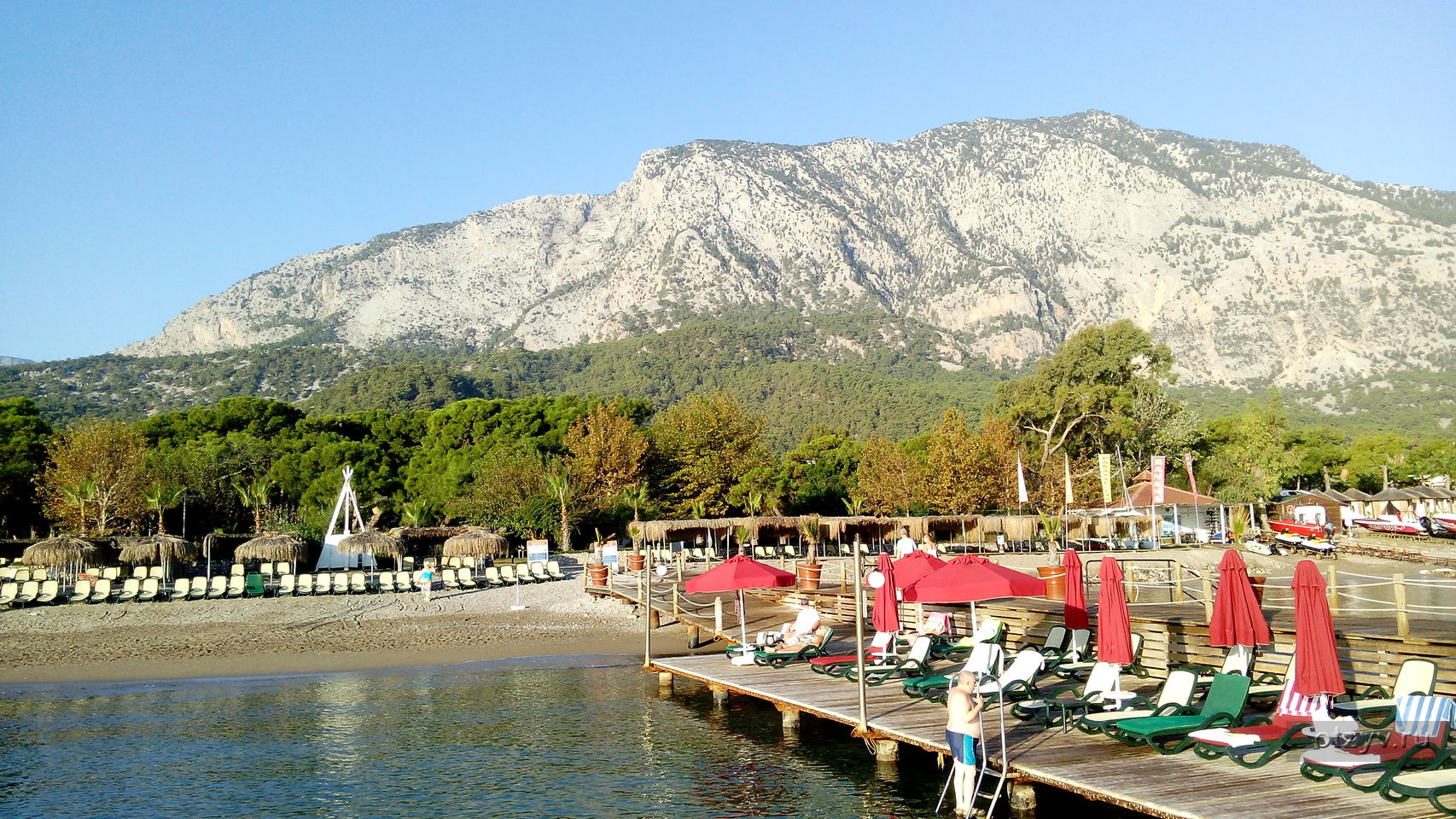 Особенно красиво смотрится этот пляж с мыса, чтобы видна была вершина Тахталы. И как видите на фото, за пляжем много зелени, там находится парковая зона, можно прогуляться и отдохнуть в тени. Здесь на этом пляже Кемера катают на лодках и яхтах.
