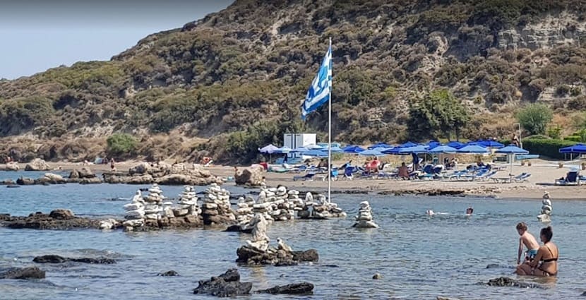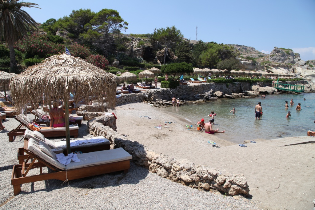 Этот секретный пляж очень компактный и безупречно чистый (чем могут похвастаться не все пляжи Родоса), с мелкой галькой, здесь играет приятная музыка, есть небольшой бар с коктейлями, ну и конечно шезлонги, зонтики, туалет и душ.