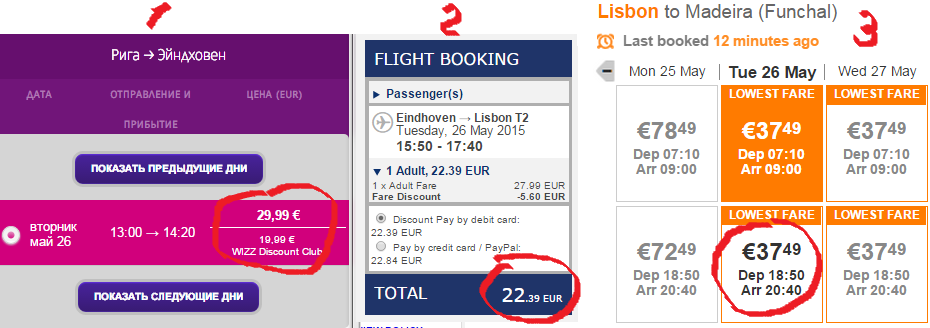 Вот пример очень бюджетного способа добраться до Мадейры (в одну сторону) с вылетом из Риги через Эйндховен (на борту Wizz Air — №1) и Лиссабон (прилет на Ryanair — №2, вылет в Фуншал на EasyJet — №3). Стоимость всех перелетов всего 90 евро (5800 руб.) — просто фантастика!