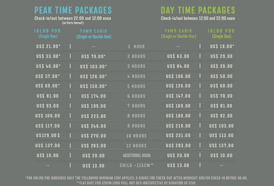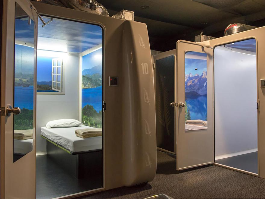 13 звуконепроницаемых кубов в Терминале №1 в зале D (раньше они были в третьем терминале, но сейчас перенесены). В каждом номере кровать, сенсорный экран с интернетом, музыкой и фильмами, а также ящик для хранения багажа. Одинарный куб стоит 75 дирхам/час, двойной — 100 дирхамю/час (к этому еще нужно прибавить 5$ налога VAT). Минимальный заказ — 2 часа.