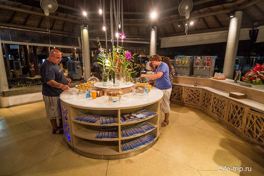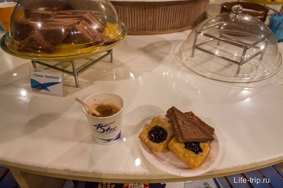 Во время длительных путешествий всегда хочется немного подкрепиться. Аэропорт острова Самуи предлагает своим клиентам множество бесплатных холодных и горячих напитков, закусок и бутербродов. Бесплатное питание организовано по принципу шведского стола. Сэндвичи с ветчиной и сыром, кукурузные хлопья, сладкие пирожки и прочие закуски красиво и аккуратно разложены на подносах под прозрачными стеклянными колпаками. Рядом с каждым таким колпаком написано название бутерброда или пирожного на английском языке. Каждый желающий может взять одноразовую пластиковую тарелочку и выбрать все, что душа пожелает.