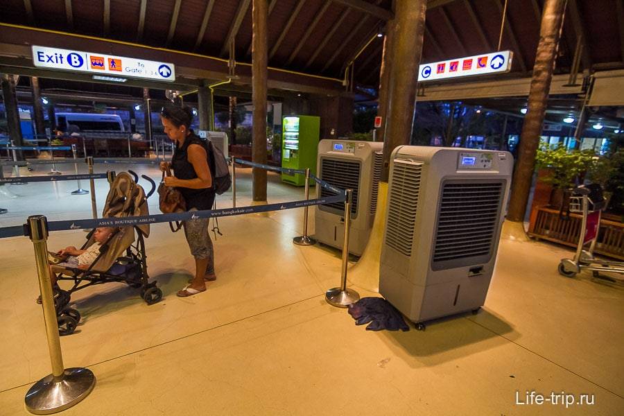 От самолета до аэропорта пассажиров доставляют небольшие электромобили, похожие на детские трамвайчики. Все службы аэропорта находятся в деревянных бунгало с тростниковыми крышами – кассы, туристические бюро, пункт бесплатного питания, кафе, зал ожидания, пункт обмена валют. Для детей имеется отличная игровая площадка с качелями и горками. Магазины расположены на торговой улочке, которая называется Самуи Парк Авеню.