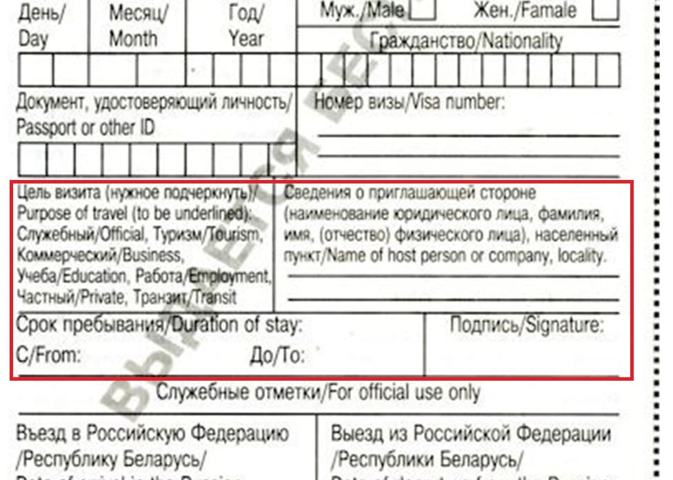 Справка! Заполнение определенных строк осуществляют пограничники. Дата приезда в РФ в карточке указывается посредством печати, также, как и дата выезда из России.