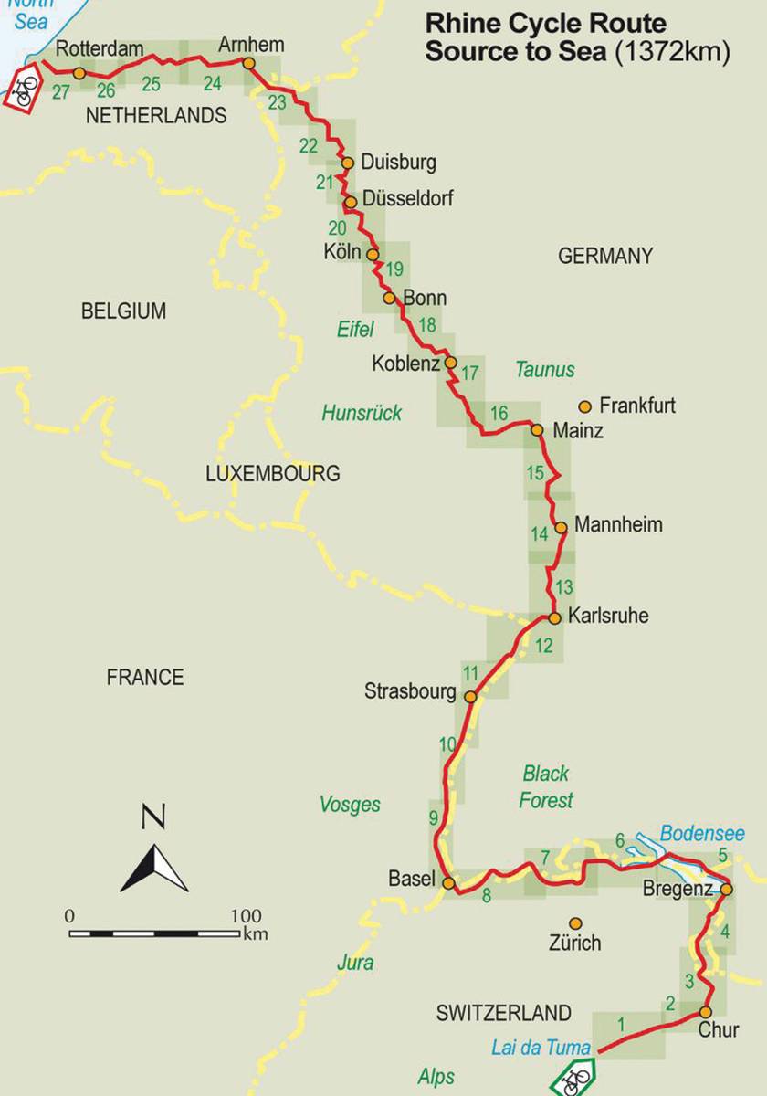 Ради чего ехать. Хорошая велосипедная дорога от швейцарских Альп до Роттердама — от истоков до устья реки Рейн; развитая велосипедная инфраструктура, путешествие преимущественно по равнинам. Можно сочетать спортивный отдых с образовательным: маршрут лежит по культурным достопримечательностям нескольких стран: Швейцарии, Германии, Франции и Нидерландов.