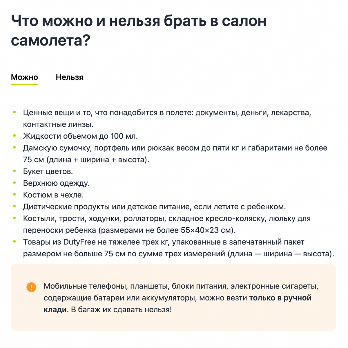 | Предметы личного пользования | Можно или нельзя брать в салон | Предъявляемые требования и ограничения |