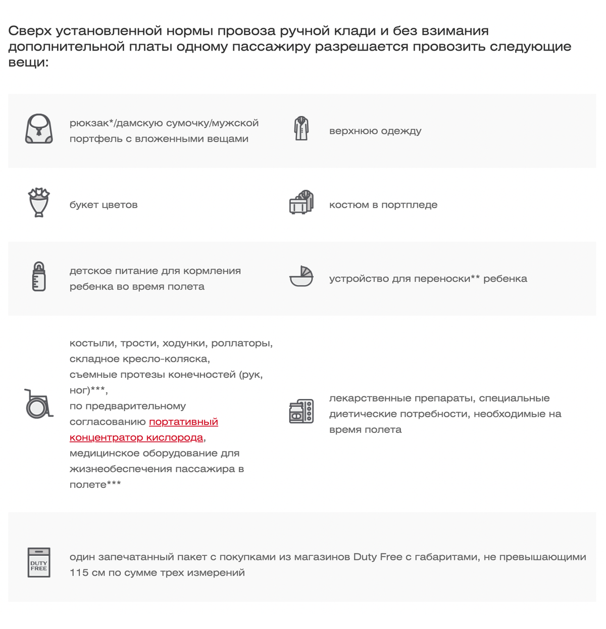 Дополнительно каждому пассажиру, разрешается без взимания платы провезти необходимые предметы, сопровождающие его (полный список уточнить у авиакомпании):