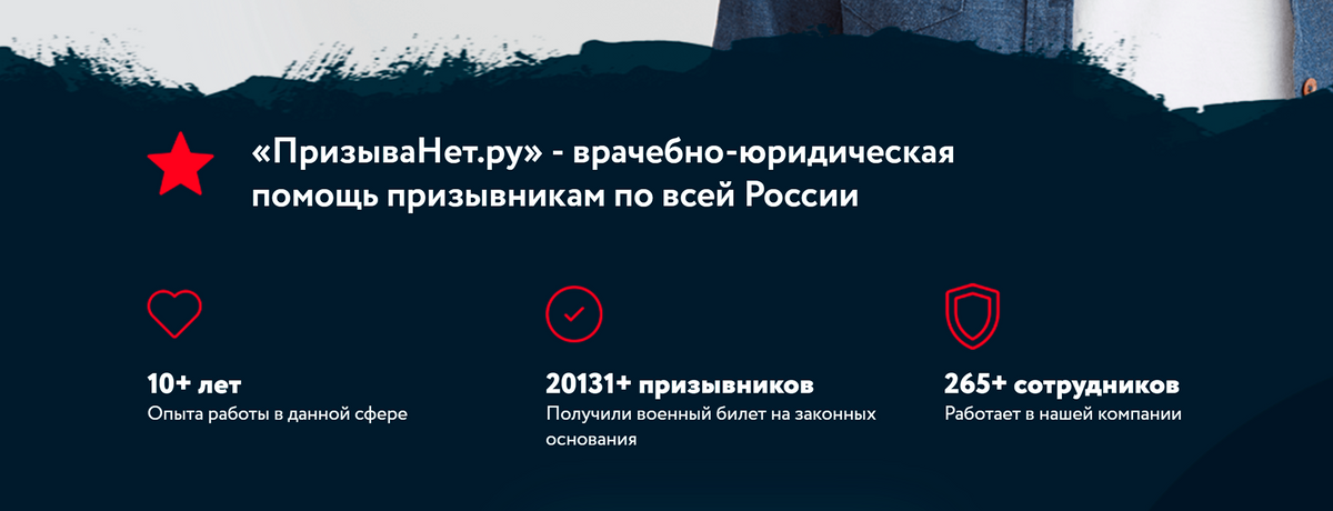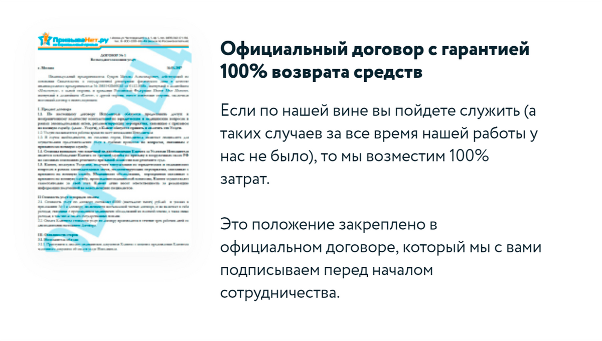 Но на сайтах компании также нашлись моменты, которые меня насторожили. В первую очередь в глаза бросаются впечатляющие утверждения: освобождение за один призыв, 95% призывников не годны к военной службе, гарантия возврата 100% средств в случае неудачи.