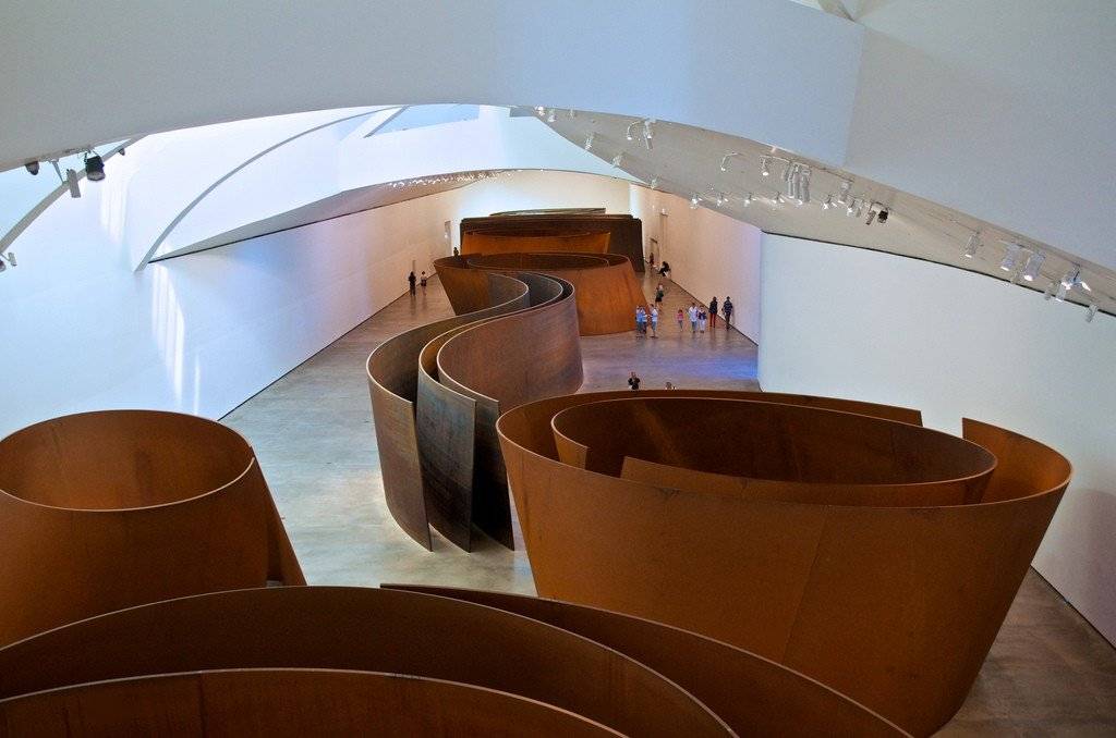 - «Суть времени» – символ музея Гуггенхайма. Работа выполнена в стиле минимализма и состоит из 8 металлических фигур, повторяющих фактуру внешней отделки здания