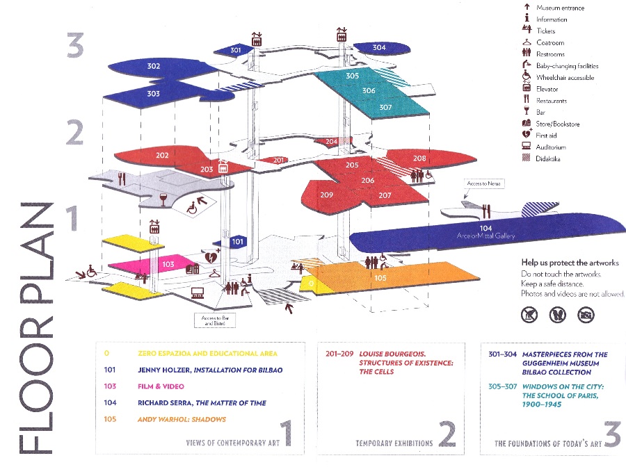 Я читала до этого, что в музее Гуггенхайма в Бильбао размещена огромная коллекция произведений современного искусства. Однако ожидаемое сильно отличалось от увиденного. Огромное здание внутри разбито на три высоких этажа. Третий этаж занимает постоянная экспозиция, там размещены картины художников середины прошлого века и позже (301-304 залы). Еще в трех залах представлены направления от кубизма до сюрреализма. Это работы начала прошлого века художников «парижской» школы (Шагал, Кандинский, Пикассо, Модильяни, Брак и др.)