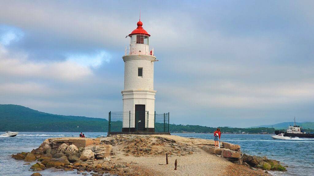 Высокая белая башня построена столетие назад и совершенно не изменилась внешне. Она располагается на Токаревской косе и по-прежнему выполняет свое главное назначение – освещает ночью Тихий океан, не давая заблудиться морякам. Высота маяка составляет свыше 10 м.