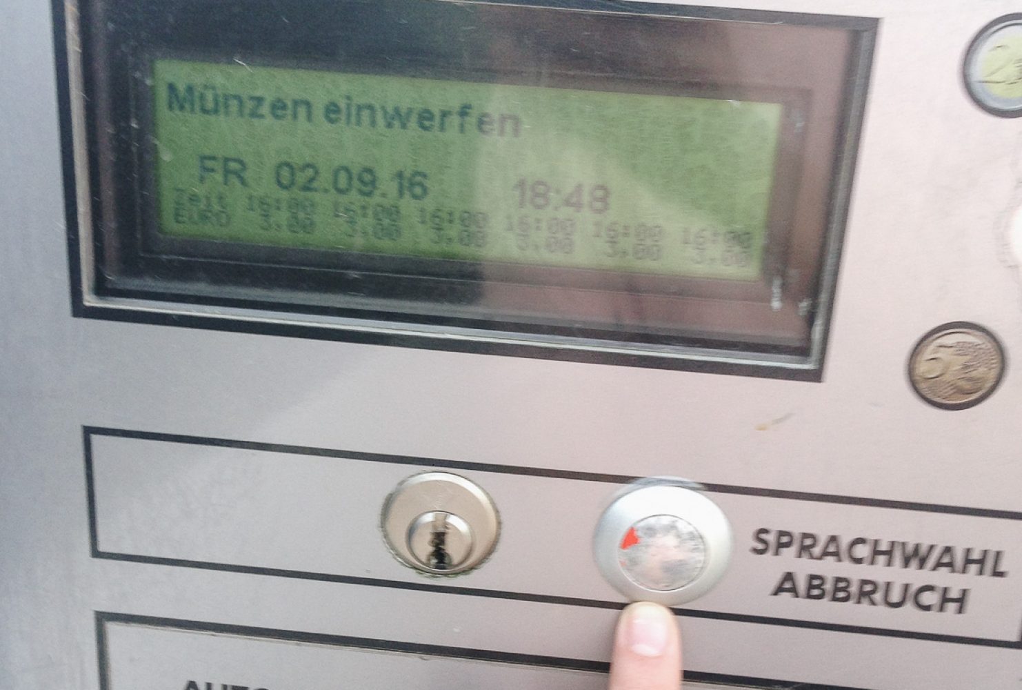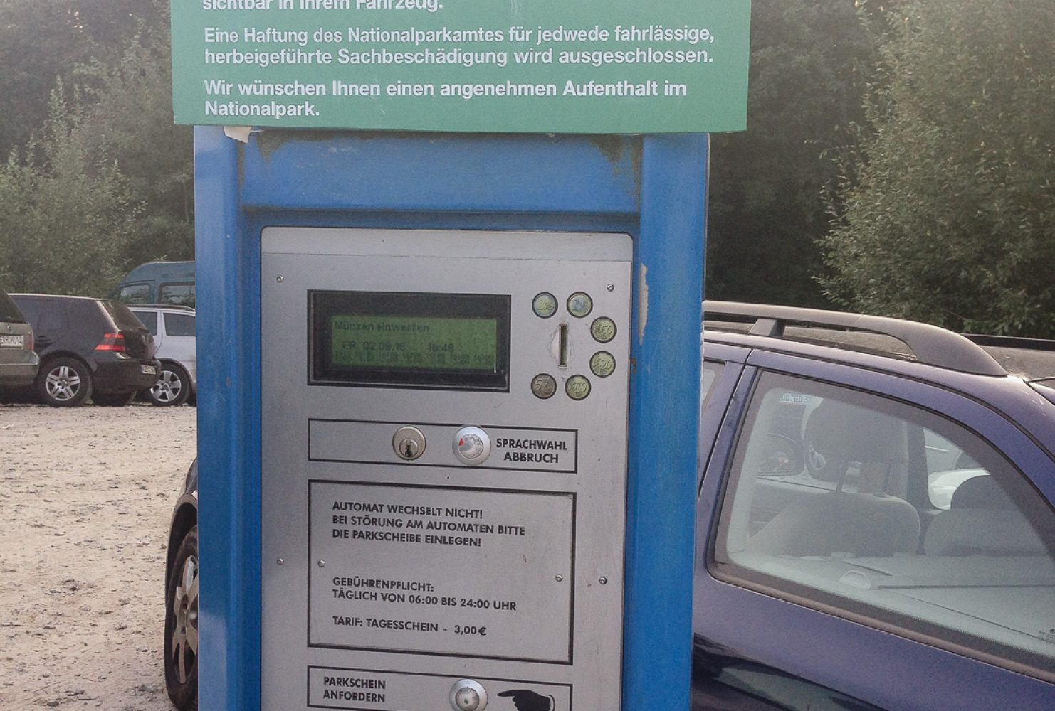 Если вы на машине и оказались на «нужном берегу» – все немного проще. Для начало нужно запарковаться при подъезде к парку. Парковка, как и почти везде в Германии – платная. Даже, как в данном случае, посреди леса стоит автомат.