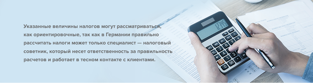 Указанные величины налогов могут рассматриваться, как ориентировочные, так как в Германии правильно рассчитать налоги может только специалист – налоговый советник, который несет ответственность за правильность расчетов и работает в тесном контакте с клиентами.