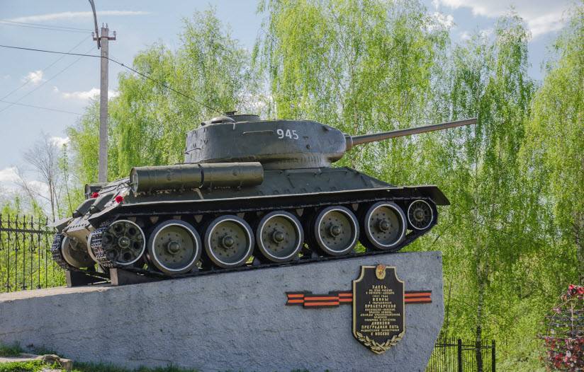 Осенью 1941 г. именно тут красноармейцы остановили наступление немецкой армии. В историю вошел подвиг Г.Г. Хетагурова, который на танке КВ-1 разбил вражеский штаб, чем нанес непоправимый урон противнику. Есть версия, что «Танк Т-34» стоит именно на том месте, где и произошло это событие.