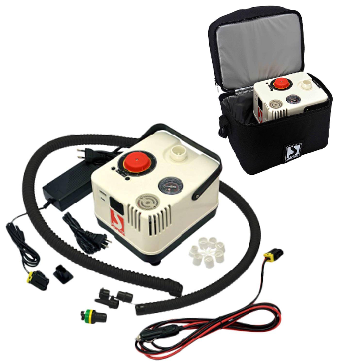 Насос для надувной лодки комплектуется воздушным шлангом длиной 3 м, электрическими проводами с зажимами для подсоединения к аккумулятору и комплектом переходников для воздушного клапана. Весь комплект хранится в чехле, выполненном из водостойкой ткани. Электрический насос оборудован двумя патрубками – нагнетательным и всасывающим. Последний может использоваться для опорожнения баллонов, при подготовке лодки к транспортировке. Компрессор снабжен регулируемым реле давления. Характеристика параметра задается вручную пользователем. При достижении уставки размыкаются контакты в цепи питания электродвигателя. Это позволит избежать накачки баллонов выше допустимых величин давления.