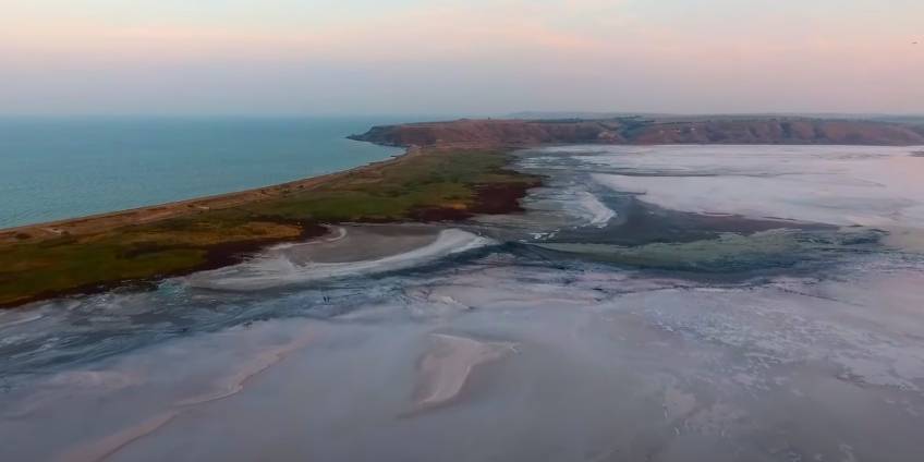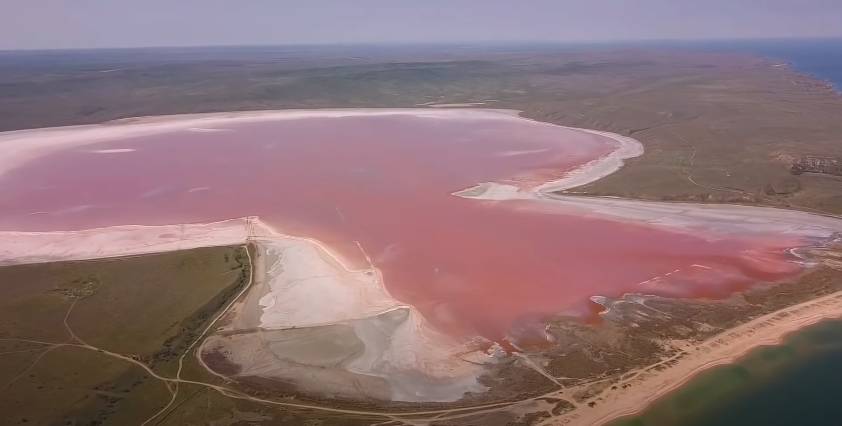 Этот неповторимый водоем является жемчужиной восточного побережья. Его длина составляет 4 км, ширина составляет 1,9 км. Глубина маленькая – до 1,5 метров. В озере соленая вода, в ней живут только галобактерии. Пигменты, выделенные ими, красят поверхность в розовый цвет. Особенно фантастически озеро выглядит весной, когда ковыль распускается: на севере простирается бирюзовое дно Азовского море, а на другой стороне белые пушистые волны колышутся бескрайние степи.