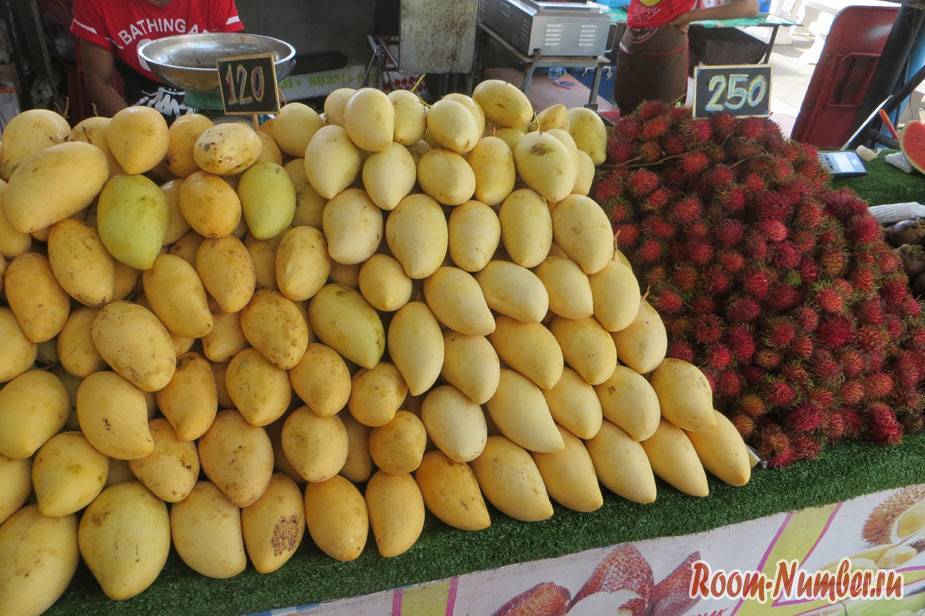 Манго чуть-чуть подороже. Обычно в ноябре-декабре манго стоит 80-100 бат за 1 кг. И я нигде в Таиланде не видела рамбутаны за такую цену — 250 бат.