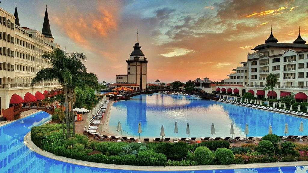Отель Titanic Mardan Palace 5* поразит любого гостя своим великолепием и восточным видом. Богатое убранство внутри, прекрасный вид на море и горные хребты. В этой гостинице расположен самый большой во всей Европе бассейн (открытый) со множеством фонтанов, мостиков, водопадов, также можно посетить аквариум и искусственно созданные острова, что привлекает многих туристов.
