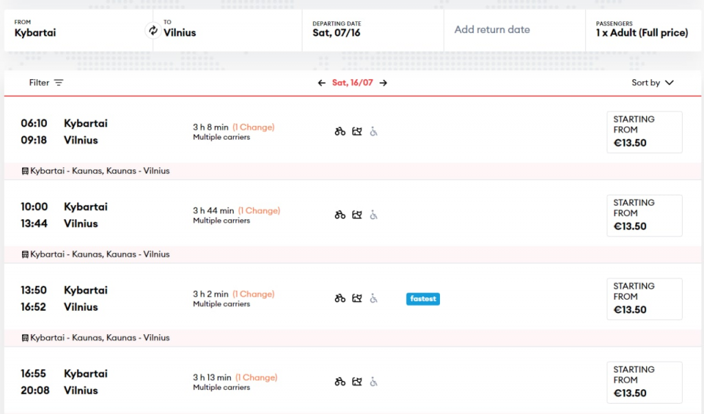 Далее пешком проходим границу Чернышевское-Кибартай. И уезжаем электричками в Вильнюс за 13.5 евро. Билеты на электрички покупаем на месте или заранее на сайте литовских железных дорог(в этом случае нужна работающая карта Visa/Mastercard и сам сайт у меня открывается только через VPN)