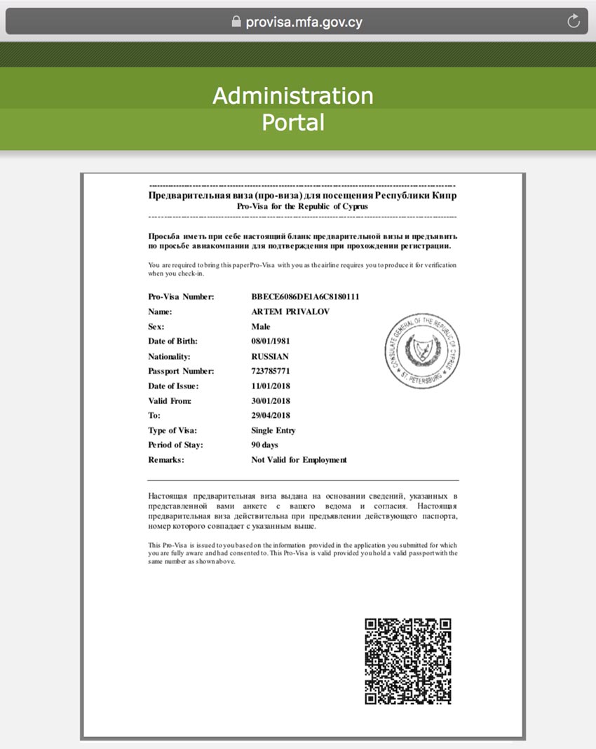 Первое, что нужно отметить, про-виза – это предварительный разрешительный документ, на основании которого гражданин России имеет право посетить Республику Кипр. Окончательное решение о разрешении или отказе во въезде в страну принимает непосредственно таможенный офицер по прилете на Кипр. Если во въезде будет разрешено, в паспорт туриста вклеивается визовая наклейка.