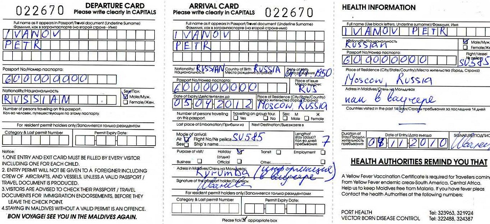 Прохождение КПП на границе без визы на Мальдивы для россиян в 2020 году требует наличия правильно заполненной миграционной карточки.