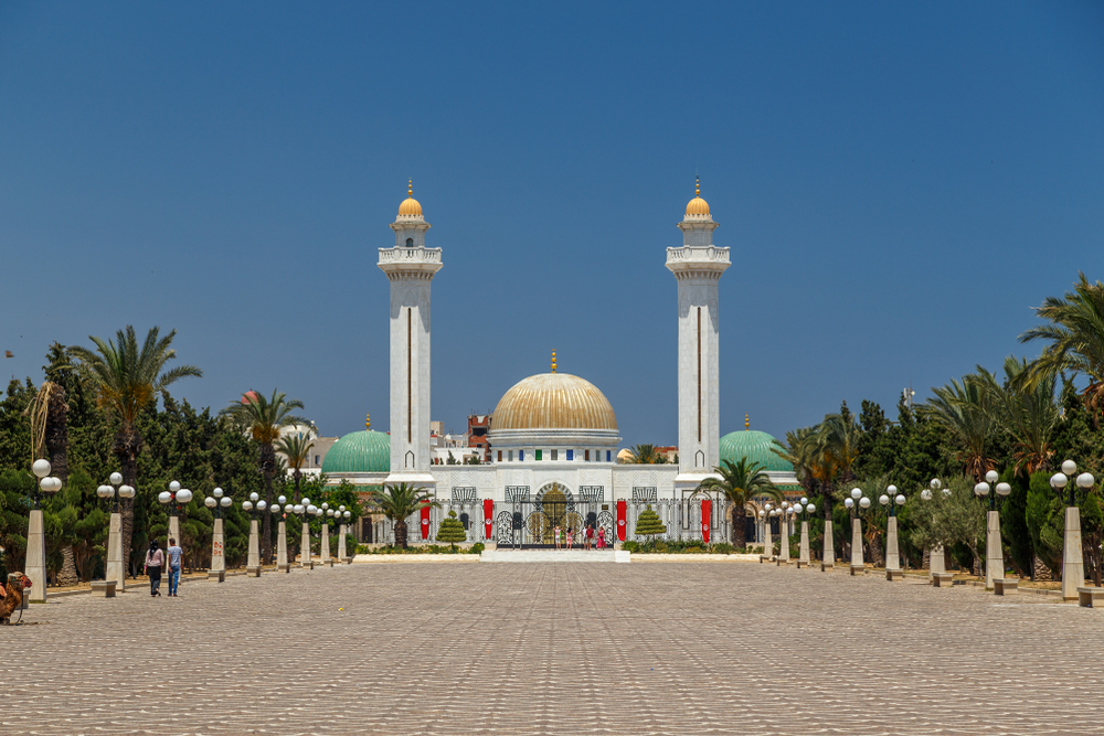 Вид на мавзолей Бургибы. Мавзолей располагается в городе Монастир, напротив крепости Рибат и посвящён первому президенту Туниса. Этот мемориальный комплекс был построен в 1963 году. Возле мавзолея, богато украшенного как снаружи, так и внутри, можно увидеть гвардейцев почётного караула.