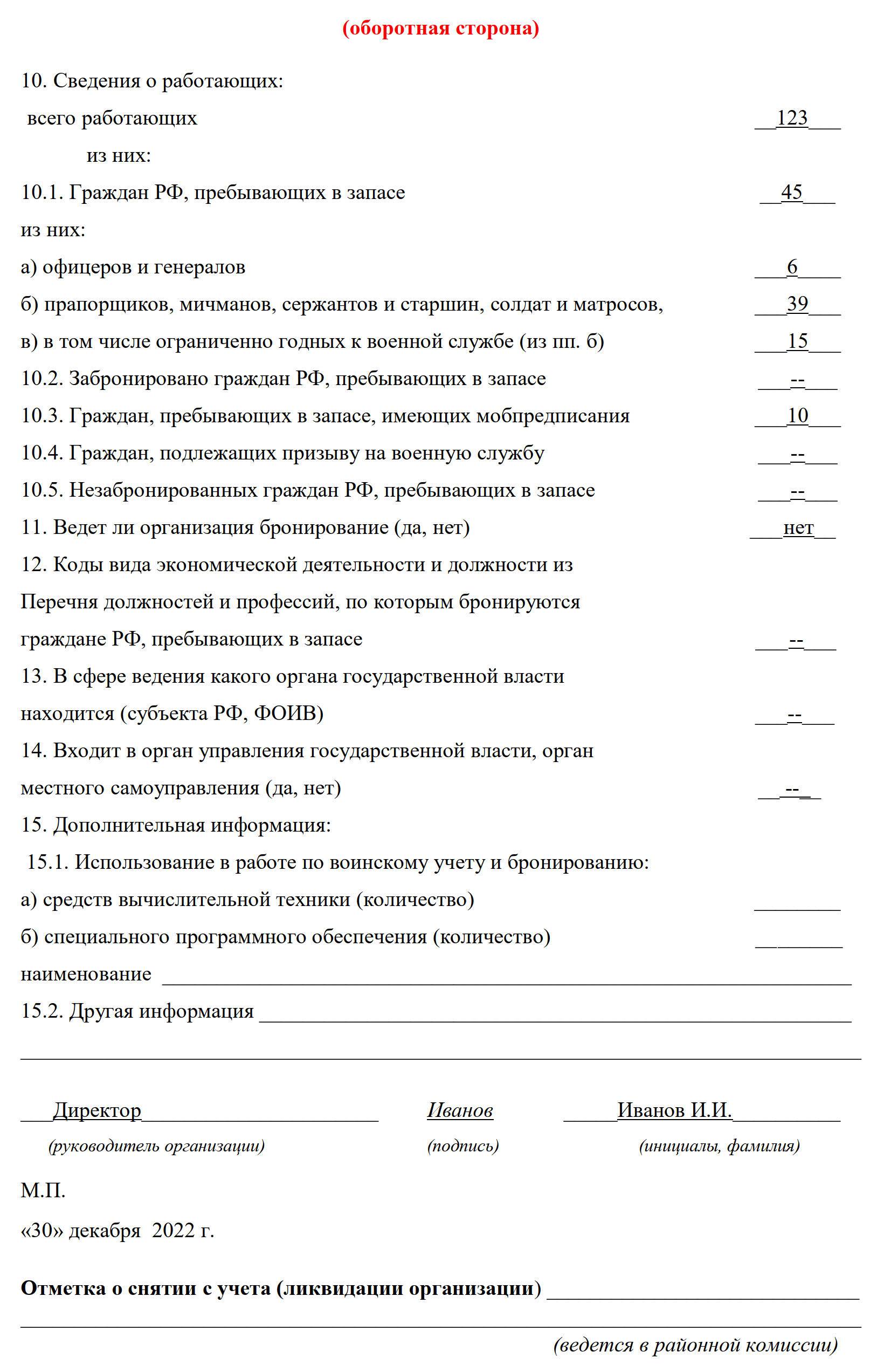 В основной части необходимо указать общие количественные сведения о военнообязанных. Если военнообязанных в организации много, то данные о лицах в запасе пишем в соответствии со званиями. Отдельно указываем количество призывников, ограниченно годных лиц в запасе и данные о брони и профессиях. В конце отчета информацию заверяют подписью и круглой печатью. Выглядит лицевая и обратная сторона бланка так: