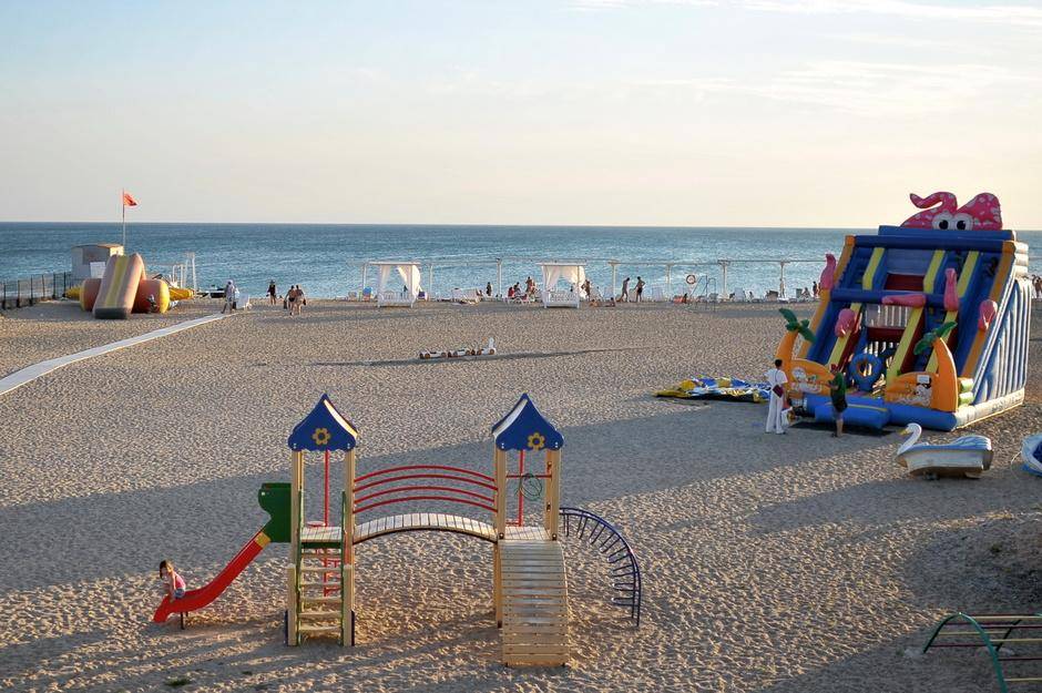 Возле санатория «Солнышко» есть еще один развлекательный комплекс, где расположены футбольные поля, площадки для волейбола и баскетбола, игровой комплекс с водными горками.
