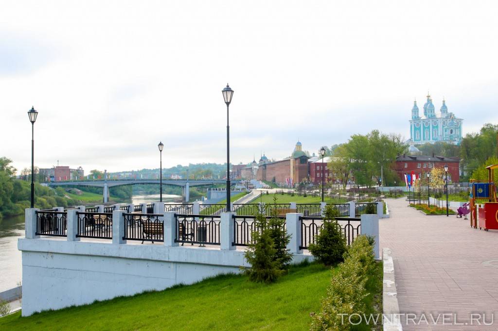 На одном участке с набережной находится неподражаемая Смоленская крепость с единственной в своем роде Пятницкой башней. Кроме того, отсюда открывается прекрасный вид на величественный Успенский собор и Нижне-Никольский храмовый комплекс.