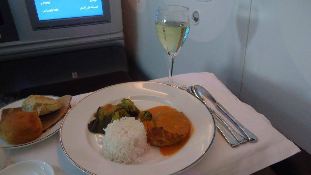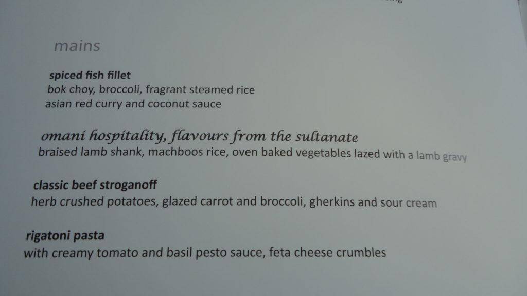 Я был в совершенном восторге от презентации еды и сервировки стола. Oman Air использует, пожалуй, самую стильную посуду в индустрии. Если говорить о самом кейтеринге, то меню было простым, но элегантным, а все попробованные мной блюда варьировались от очень высокого качества до просто роскошного. Винная карта, представленная в основном винами из Австралии и Новой Зеландии, пришлась мне по вкусу; при этом вино в бокал наливают при тебе, давая возможность сперва его продегустировать.