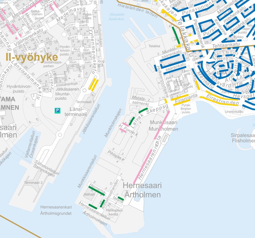 2. В той же части города есть еще несколько улиц с бесплатной парковкой – их стоит искать у паромных терминалов «St.Peter Line / Moby SPL» и «Eckerö Line». Здесь должны быть места как с долгосрочной (отмечены тёмно-зелёным цветом), так и с краткосрочной парковкой (отмечены розовым цветом).