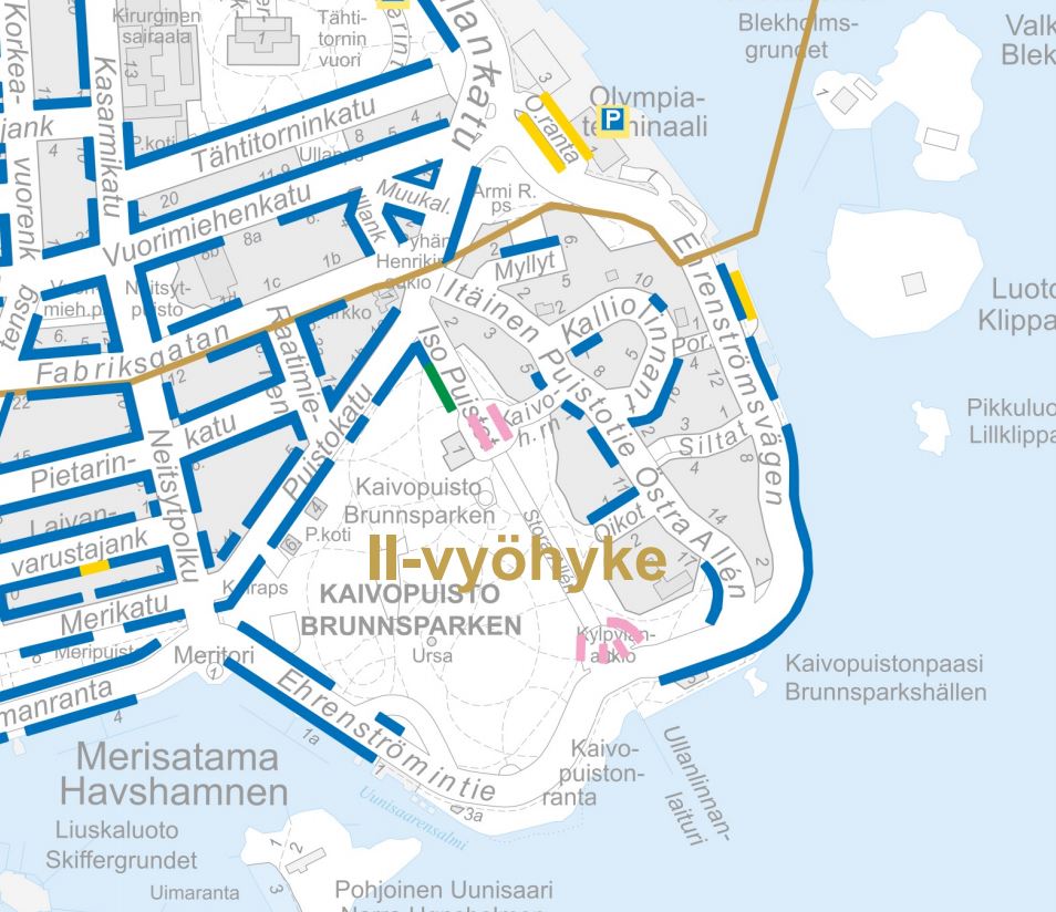 7. Наконец в районе Катаянокка у парка Laivastopuisto тоже можно попробовать найти несколько парковочных мест рядом с Katajanokanranta/Merisotilaankuja (отмечены розовым цветом).
