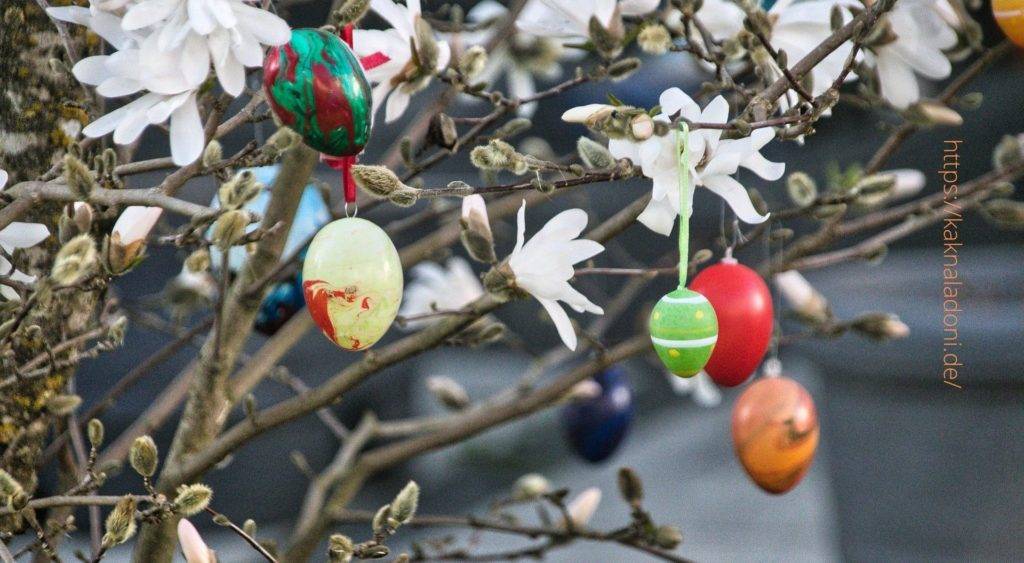В Германии принято украшать окрашенными яйцами свои дома, деревья и кусты. В домах яйца вешают на срезанные ветки. Украшенные деревья называют «Ostereierbaum».