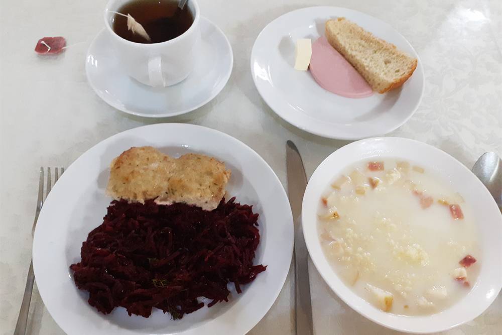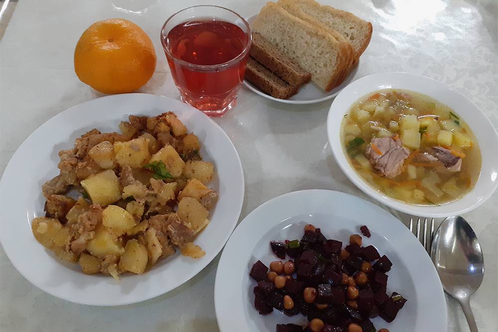 Обед. Это всегда несколько супов на выбор: гороховый, борщ, харчо — и салат. На второе обычно котлета или другое мясо с гарниром. Обязательно подают фрукты и компот.