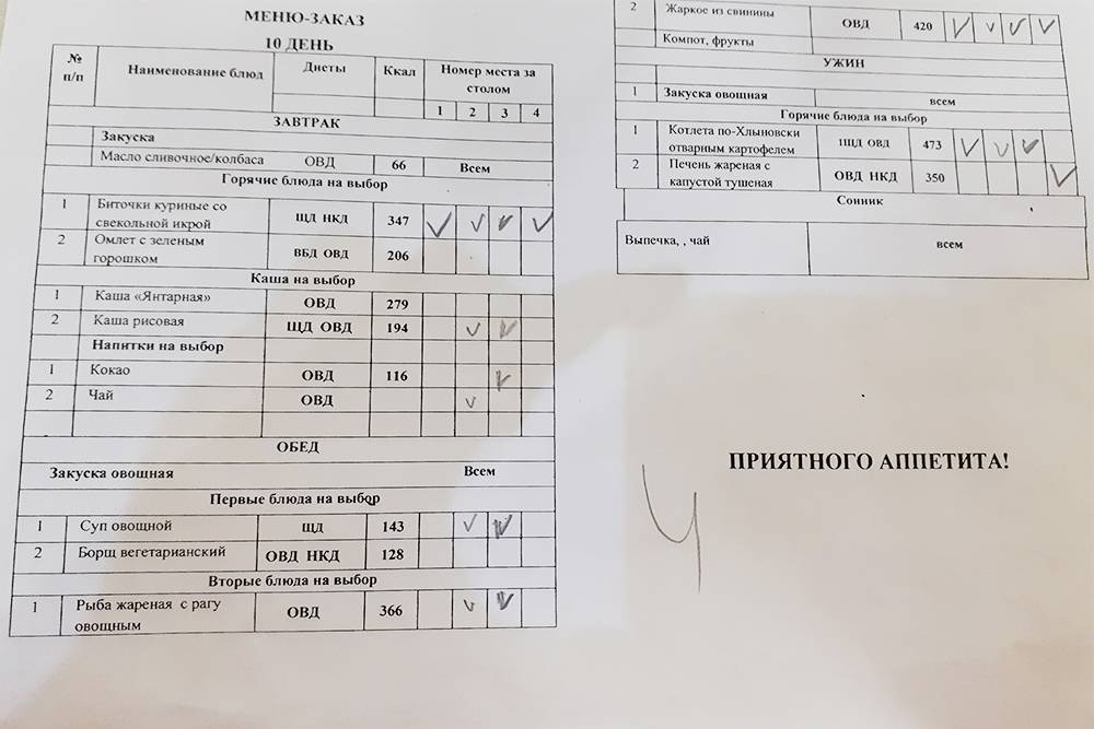 - Меню-заказ — гостям предлагают выбор из двух-трех блюд на завтрак, обед и ужин. Докупить что-то дополнительное, чего нет в меню, в санатории не получится.