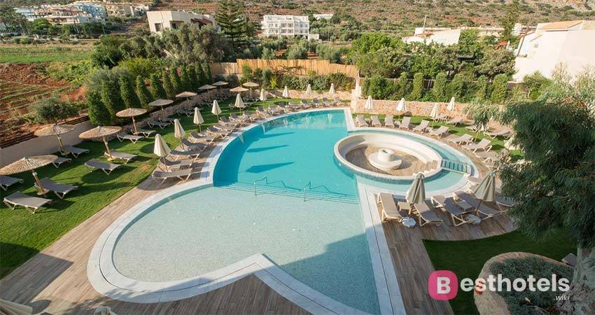 Расположен в тихом критском поселке − Георгиуполис. Семейный отель по уровню немного ниже VIP, но это компенсирует шикарная детская концепция и стоимость. Проживание – от 8 177 рублей. Дети до 13 лет могут жить в отеле бесплатно, а взрослыми считают детей с 15 лет. Отель предлагает много развлечений для детей и подростков. Минус, до пляжа нужно пройти по туннелю под дорогой.