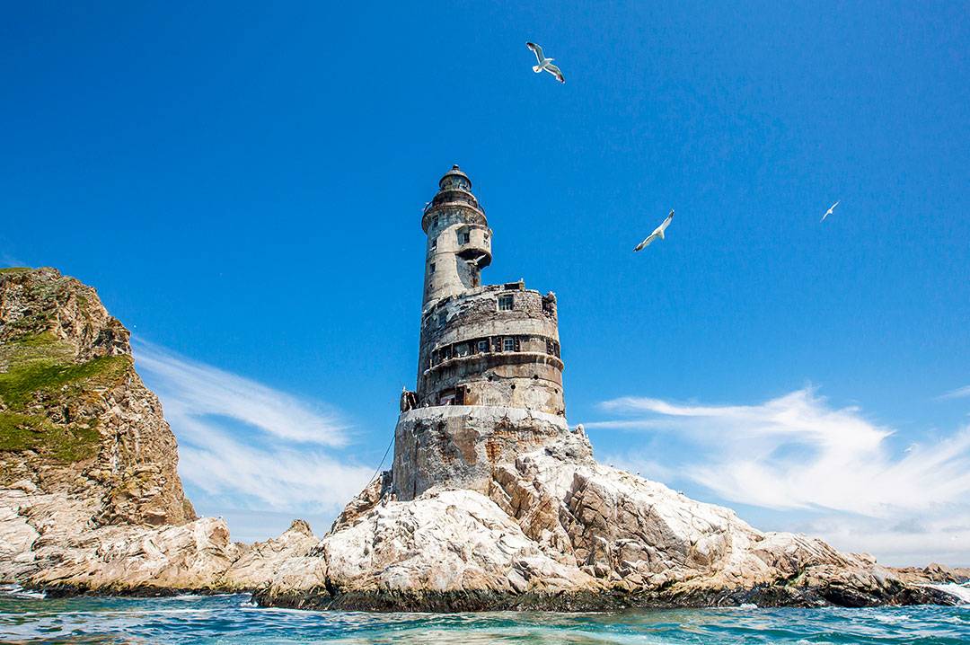 - Как добраться: проблематично — маяк построен на небольшой скале Сивучья в суровом проливе Лаперуза, добраться к нему можно только по воде — по суше попросту не получится. На лодке подойти сюда тоже непросто: течения сильные, дно изобилует каменистыми банками и отмелями.