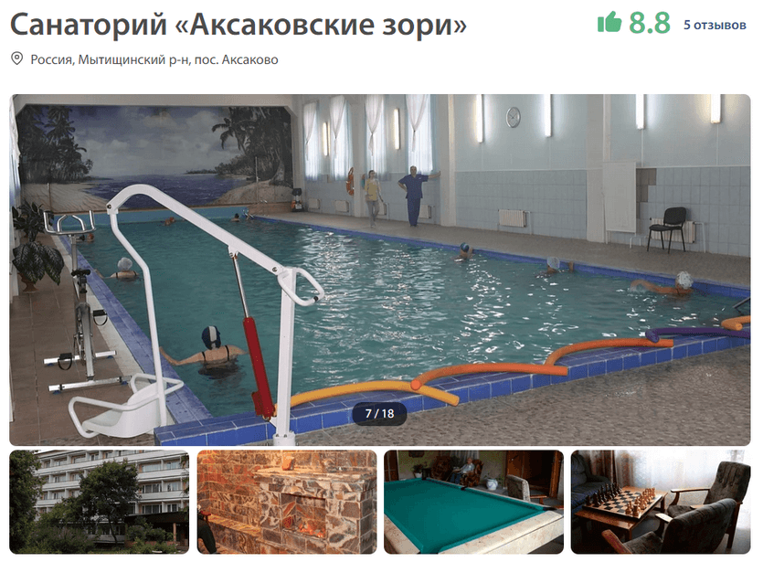 Уютный санаторий в Подмосковной деревне Аксаково. Это экологически чистый район с живописным лесом и протяженными аллеями. Территория пансионата удобна для неспешных прогулок. С нее можно попасть на пляж и лодочный причал. Жилые номера размещены в двух 5-этажных корпусах, лечебный корпус стоит отдельно. В этом санатории отдыхают люди пенсионного возраста – молодежи, судя по отзывам, тут будет скучно. Стоимость проживания включает в себя питание, согласно выбранному тарифу. В пансионате есть бассейн, спортивные площадки, библиотека и другие развлечения для организации досуга.