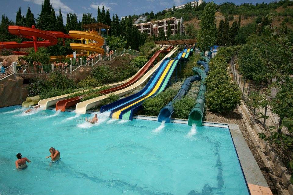 Аквапарк в Алуште – это 6 бассейнов, 4 крутых спуска с горок, зона для отдыха с малышами. Для взрослых посетителей функционирует зона «релакс». Желающие могут посетить даже солярий. Есть в аквапарке также джакузи, искусственный водопад, бассейн с волнами.