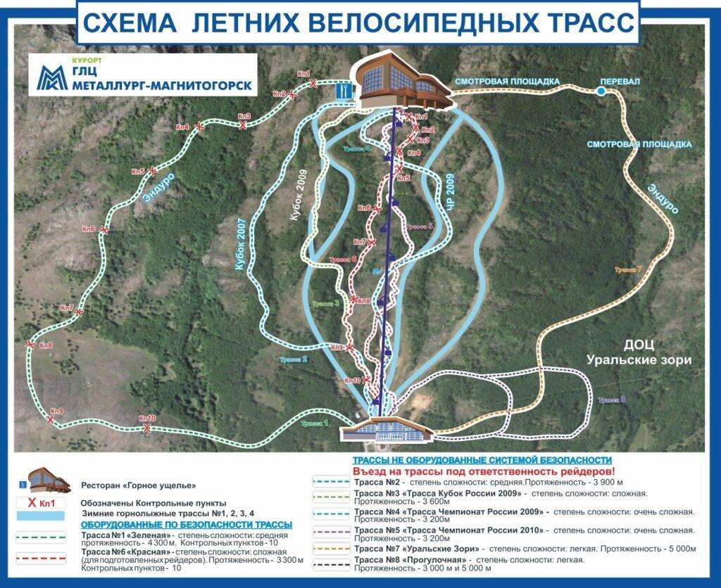 Профессионалы могут насладиться трассой для хафпайпа и тюбинга, что позволит провести время с морем впечатлений. Семь действующих трасс ГЛЦ «Металлург-Магнитогорск» рассчитаны на разные уровни мастерства. Перепад высот колеблется от 42 метров до 450 метров. На трассах присутствуют снежные вентиляторы и генераторы снега, благодаря этому горнолыжный сезон длится с ноября по апрель. Длина трасс достигает 2,5 километров, минимальная длина трассы 300 метров, это позволяет обучающимся катанию получить необходимый опыт и потренироваться (уклоны от 12 до 14 градусов).