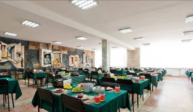 Размещение в номерах со всеми удобствами (все номера со своим санузлом, WI-FI ,кондиционером, ТВ, часть номеров с балконами.Окна выходят на парковую зону.Питьевая вода в кулере в вестибюлях на этажах (горячая и холодная).Гладильная комната на этаже.В каждом корпусе в бытовой комнате есть стиральные машинки.