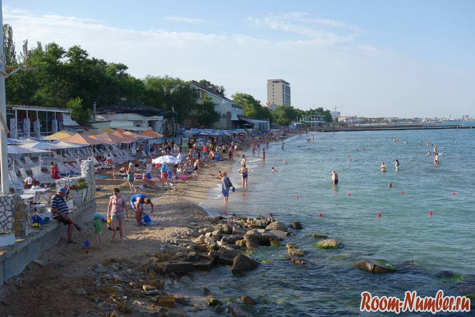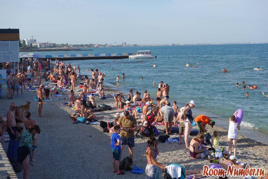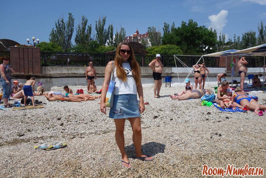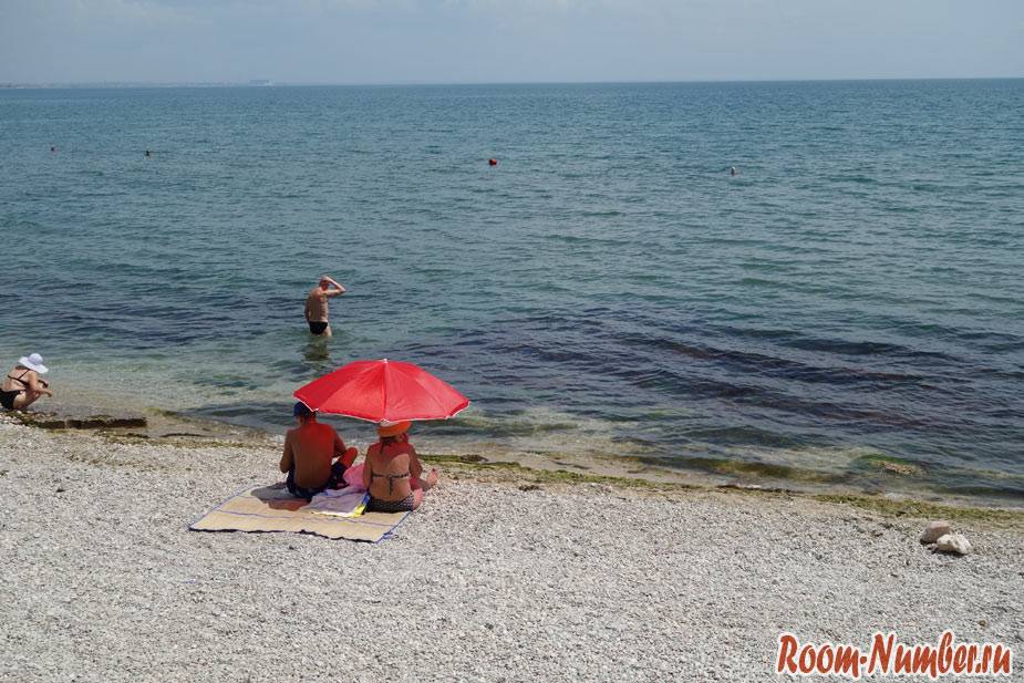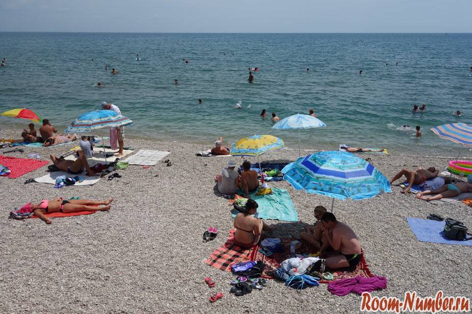 Пляж галечный, а не песочный. Он так и называется — «пляж Камешки». Мы советуем сразу купить обувь для плавания, чтобы не мучиться при заходе в воду. Босиком ходить по камням болезненно, особенно с непривычки.
