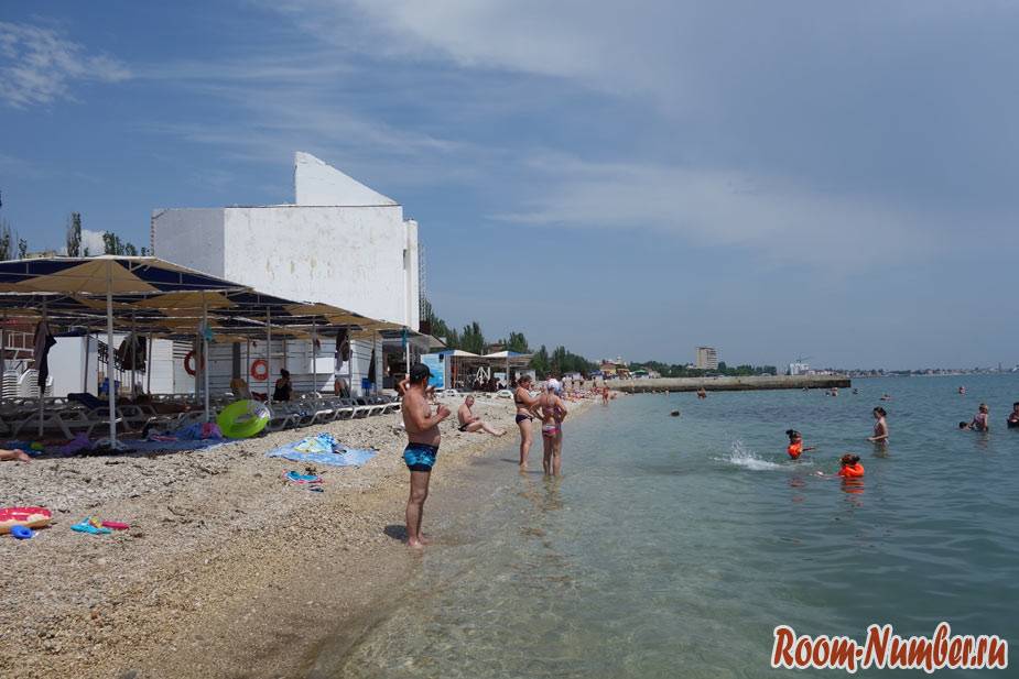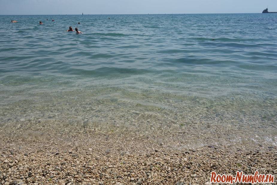 Заход в море плавный. Глубина не сразу. Удобно купаться с детьми. Волны в сезон обычно минимальные или их совсем нет. Вода прозрачная, видно дно, но преимущественно только около берега.