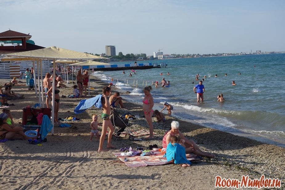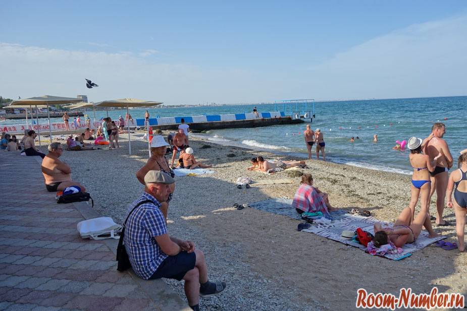 На пляже есть раздевалки и вышки спасателей. А вот с туалетами пока большая напряженка. Туалетов очень мало и они встречаются редко. В России в принципе напряженка с публичными туалетами и Крым не стал исключением. Туалеты платные, стоят обычно 15-20 руб. Если так и не смогли найти ближайший, то можно попроситься в столовую, бывает пускают даже бесплатно, люди добрые. Также на пляже нет душа с пресной водой.